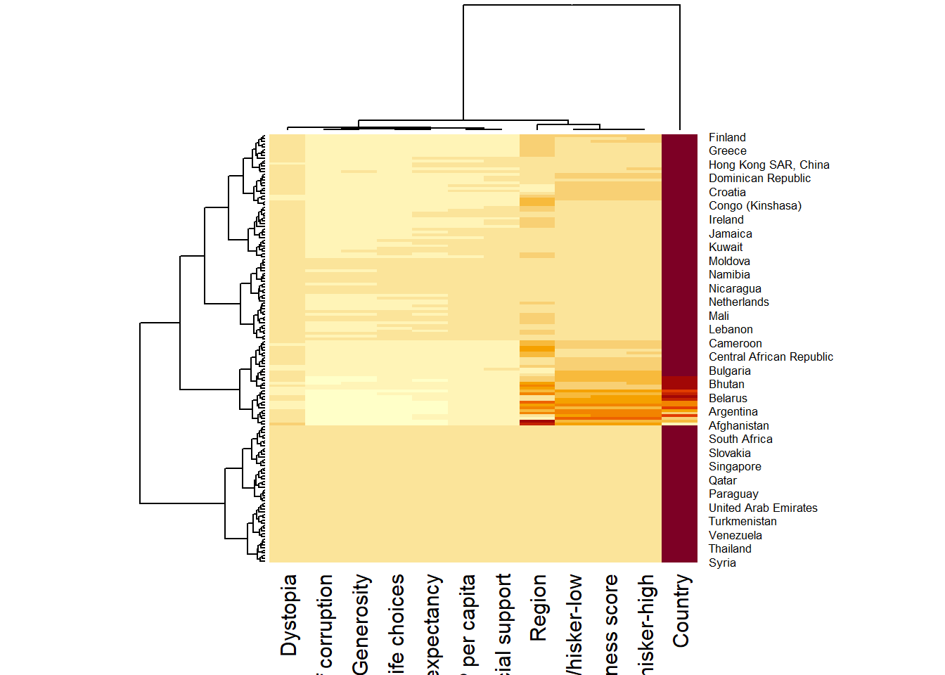 Here, red cells denotes small values, and red small ones. This heatmap is not really informative. Indeed, the Happiness Score variable have relatively higher values, what makes that the other variables with small values all look the same. Thus, we need to normalize this matrix. This is done using the scale argument. It can be applied to rows or to columns following your needs.