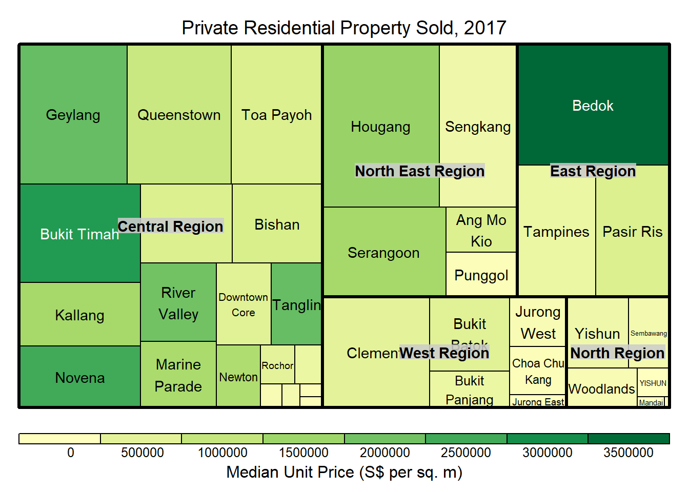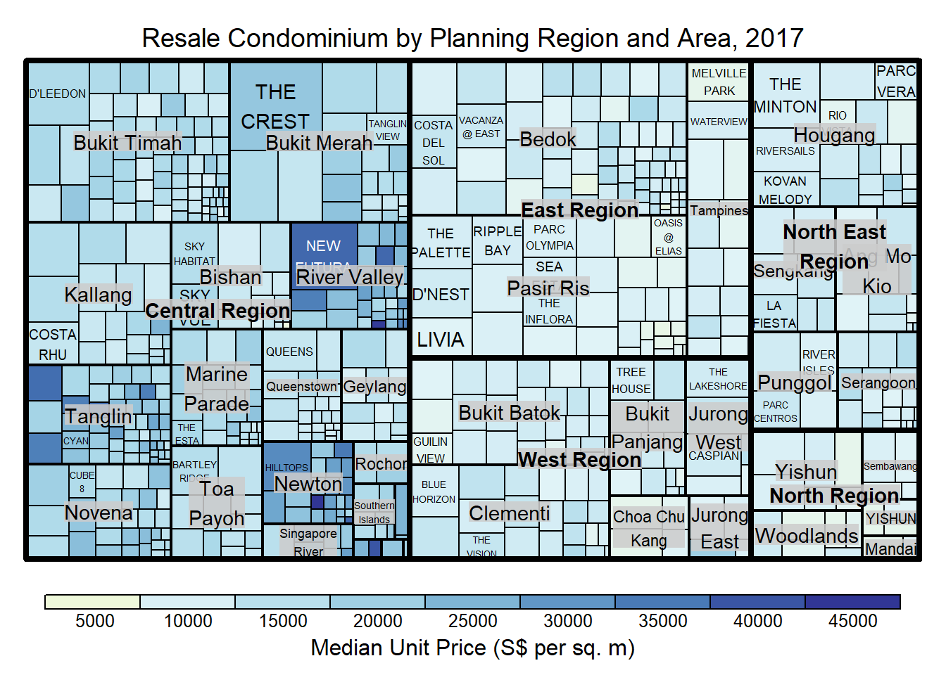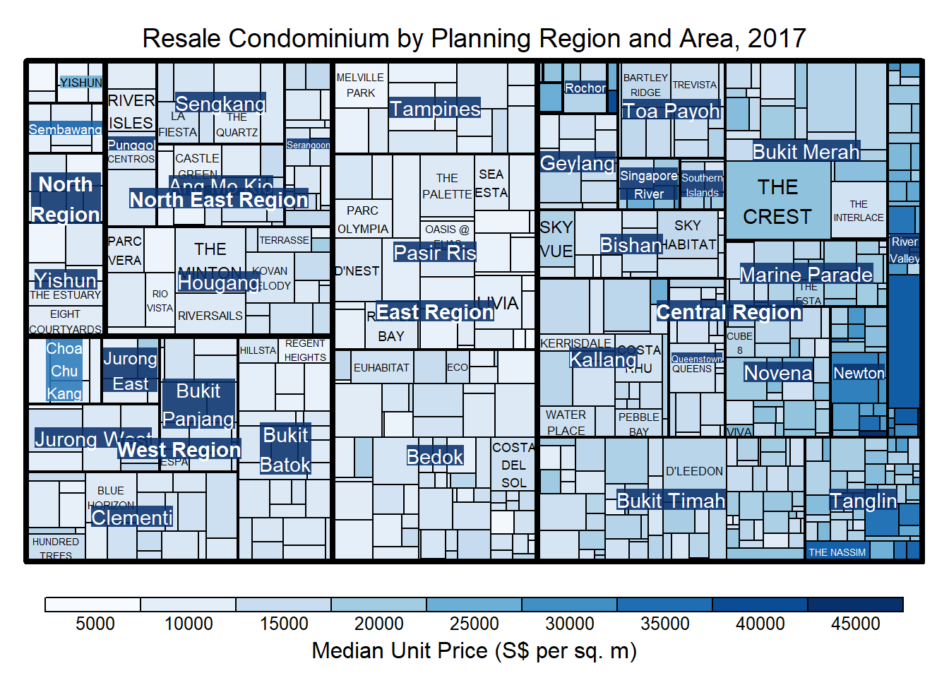 In this section, treemap() of Treemap package is used to plot a treemap showing the distribution of median unit prices and total unit sold of resale condominium by geographic hierarchy in 2017.