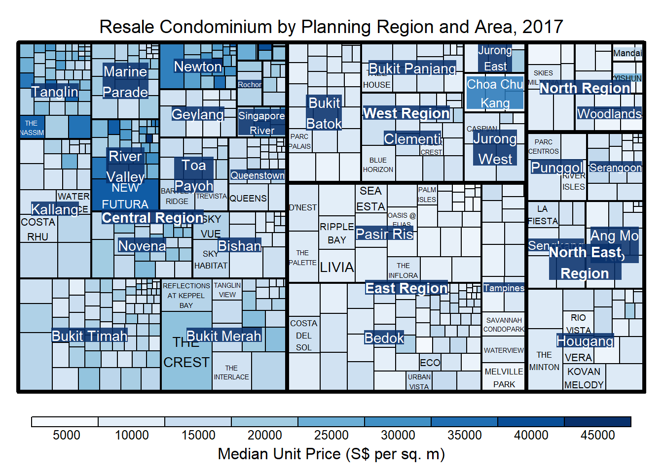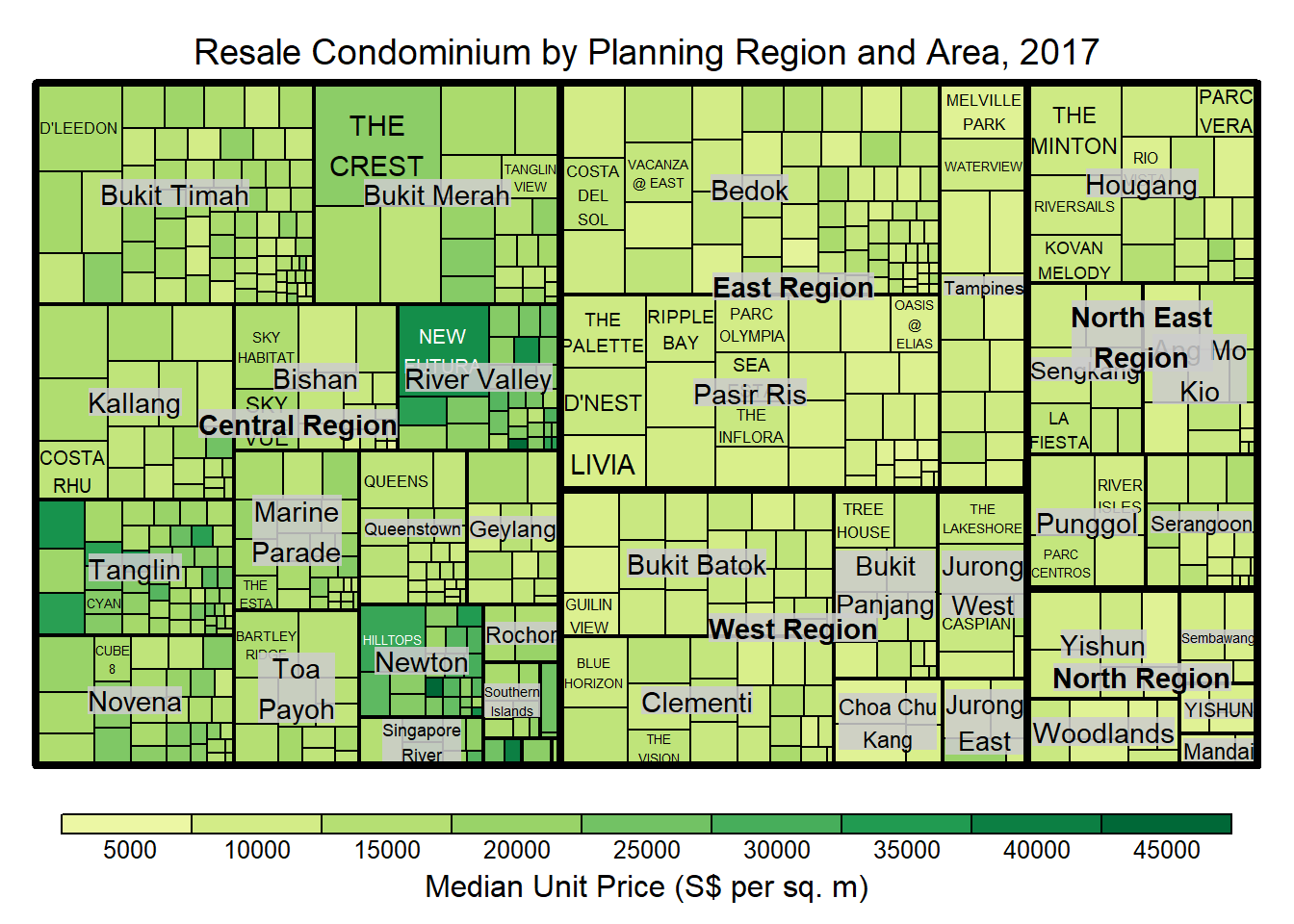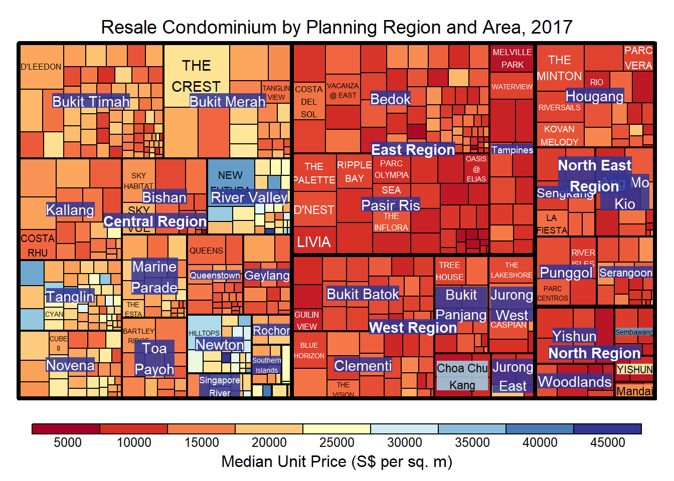 In this section, treemap() of Treemap package is used to plot a treemap showing the distribution of median unit prices and total unit sold of resale condominium by geographic hierarchy in 2017.