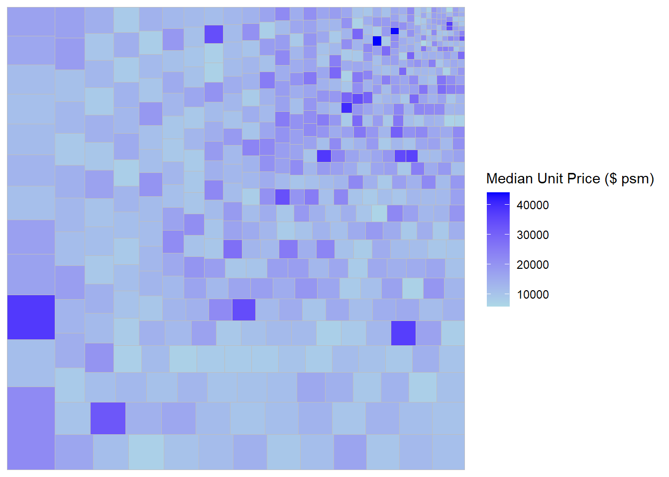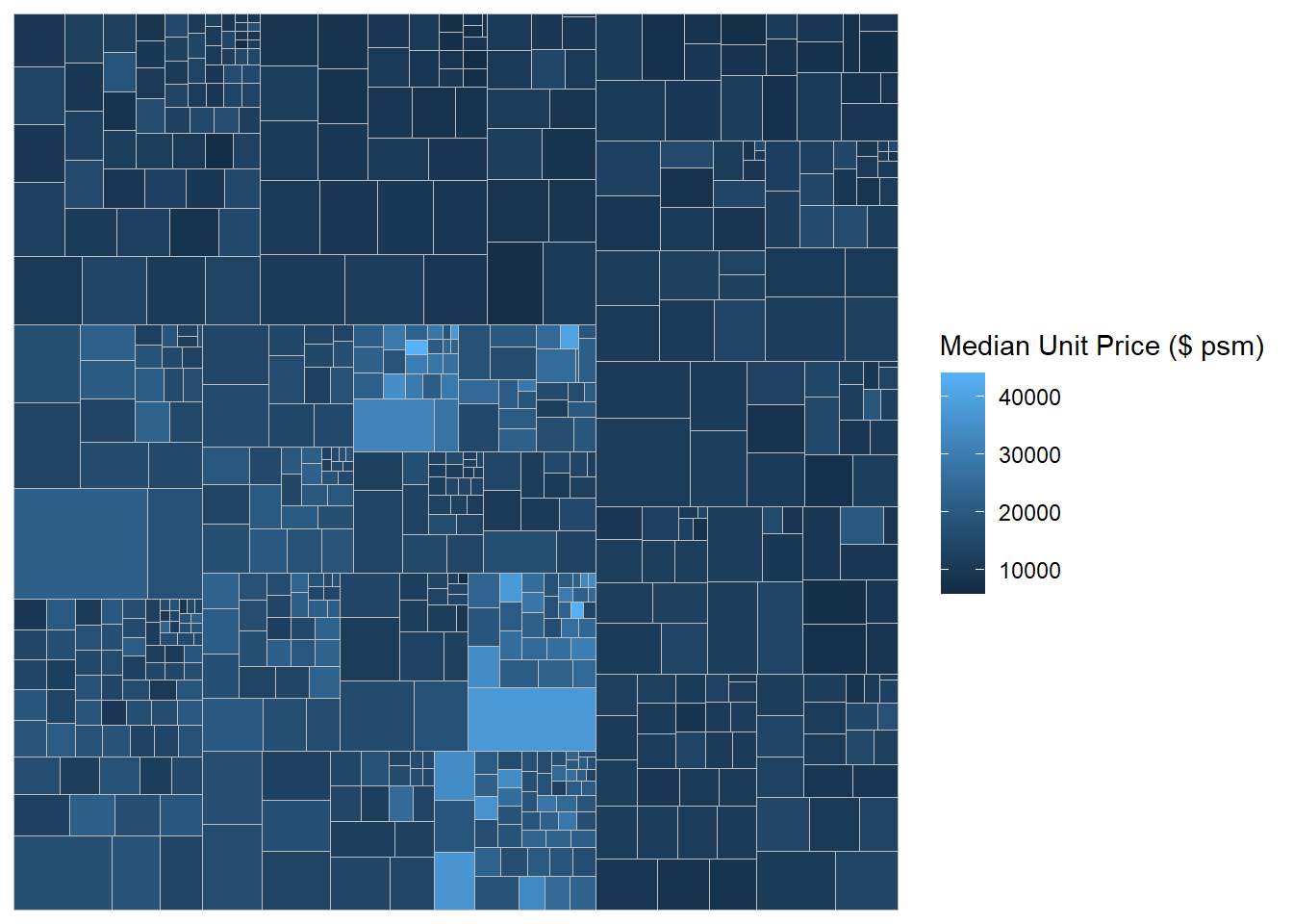 The rectangles are coloured with different intensity of green, reflecting their respective median unit prices.