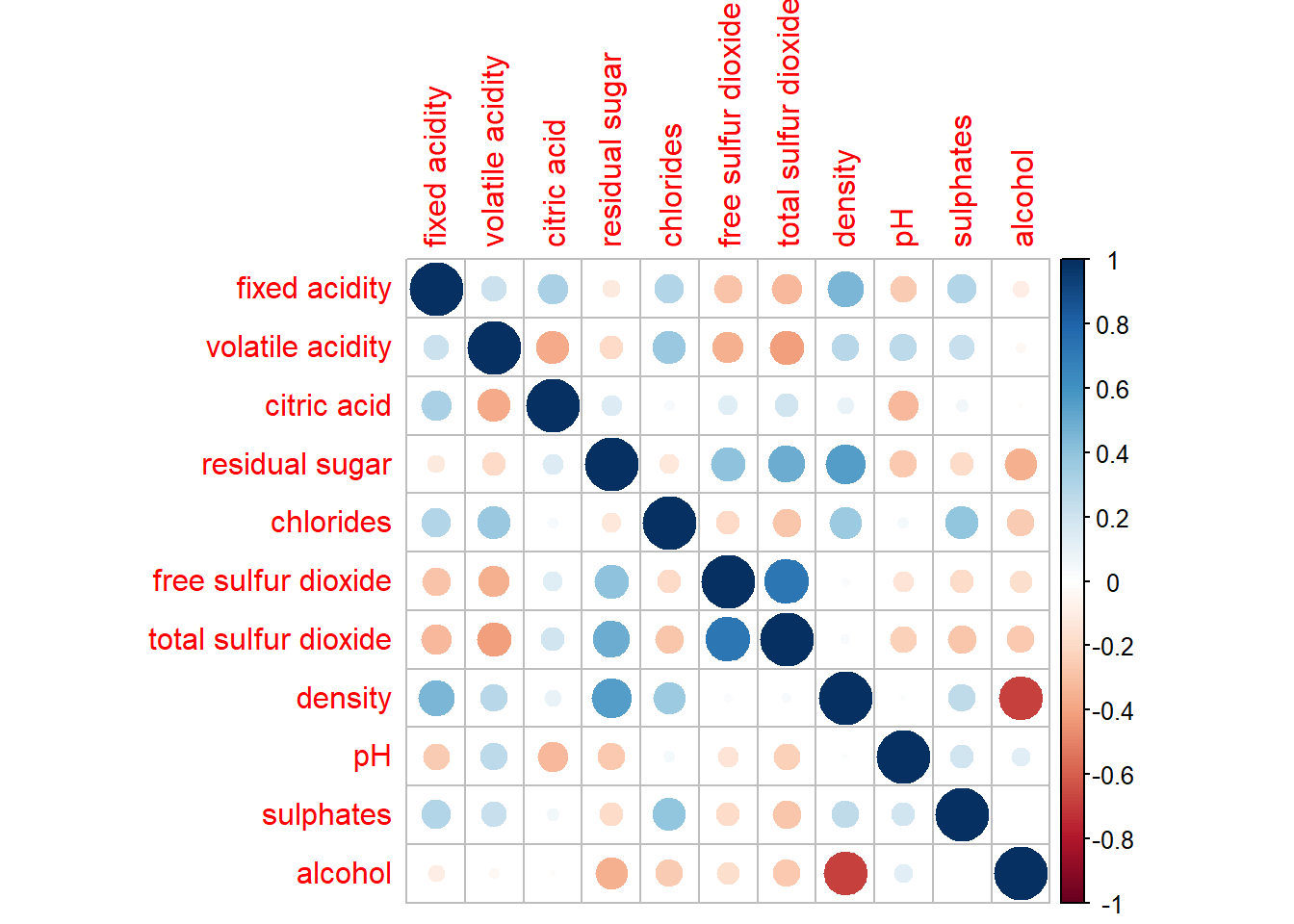 wine.cor <- cor(wine[,1:11])Next, corrplot() is used to plot the corrgram by using all the default setting as shown in the code chunk below.