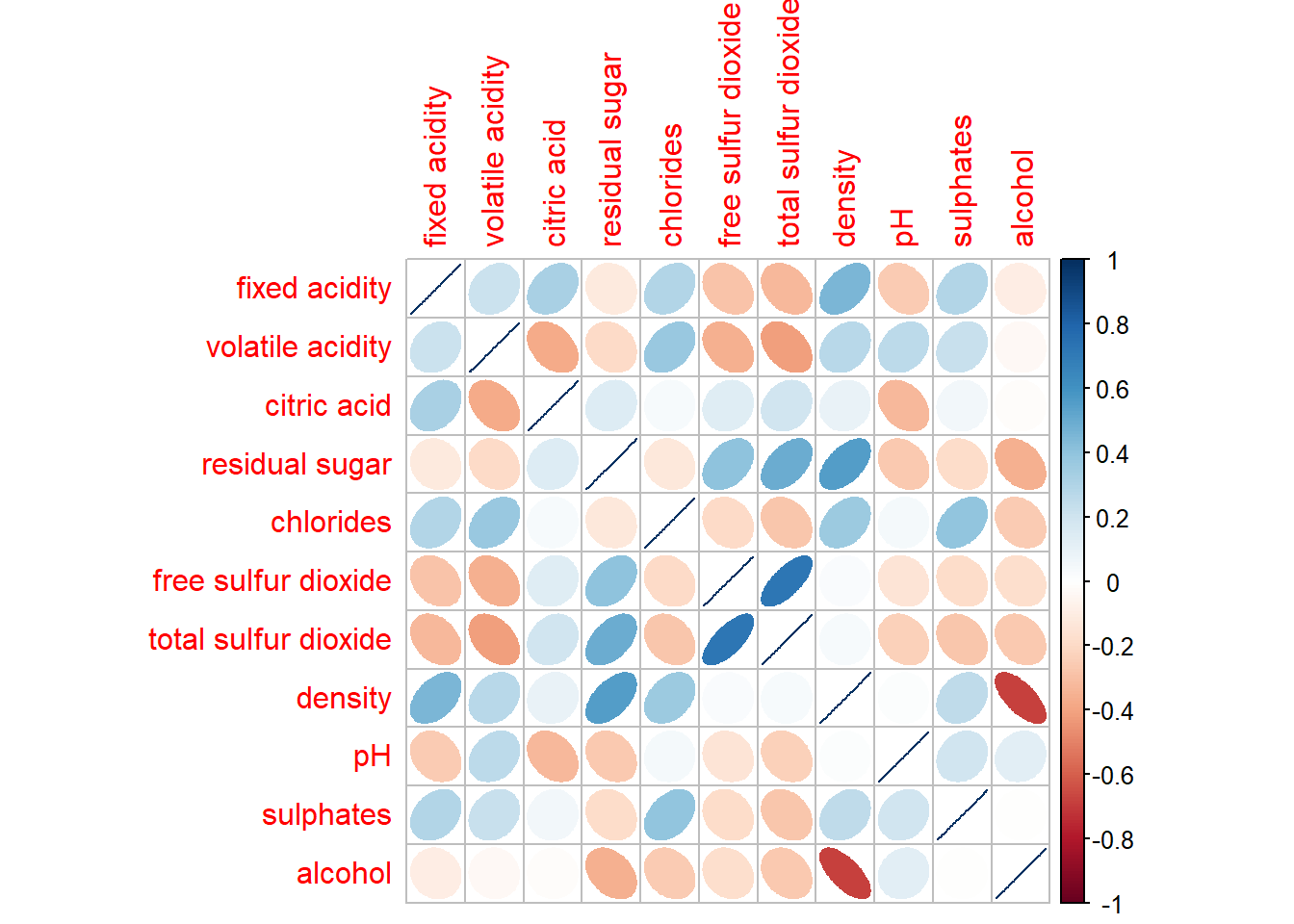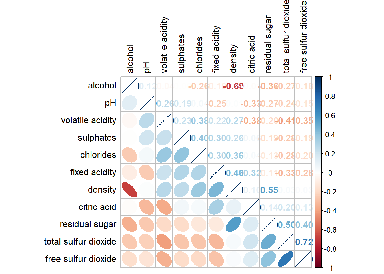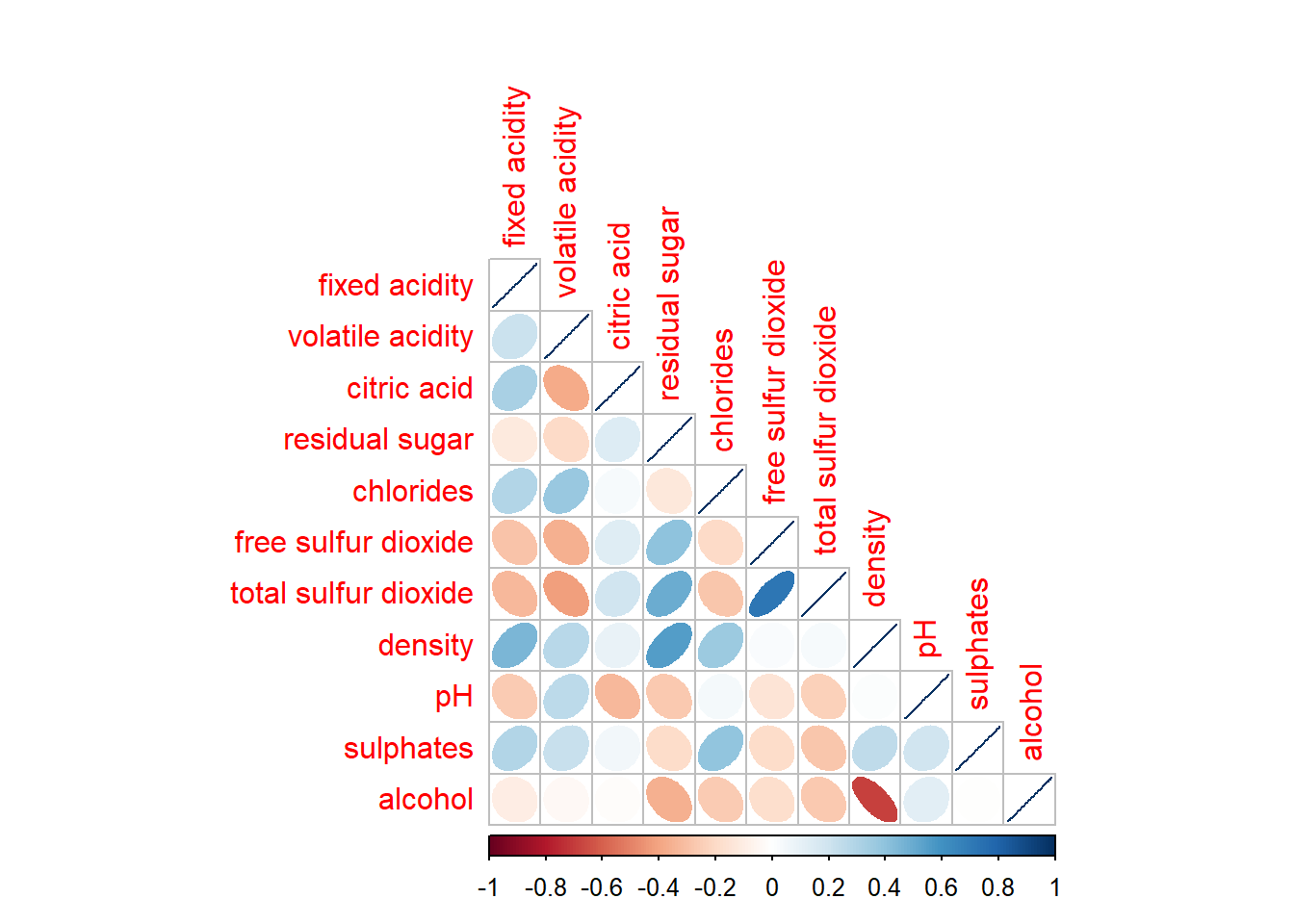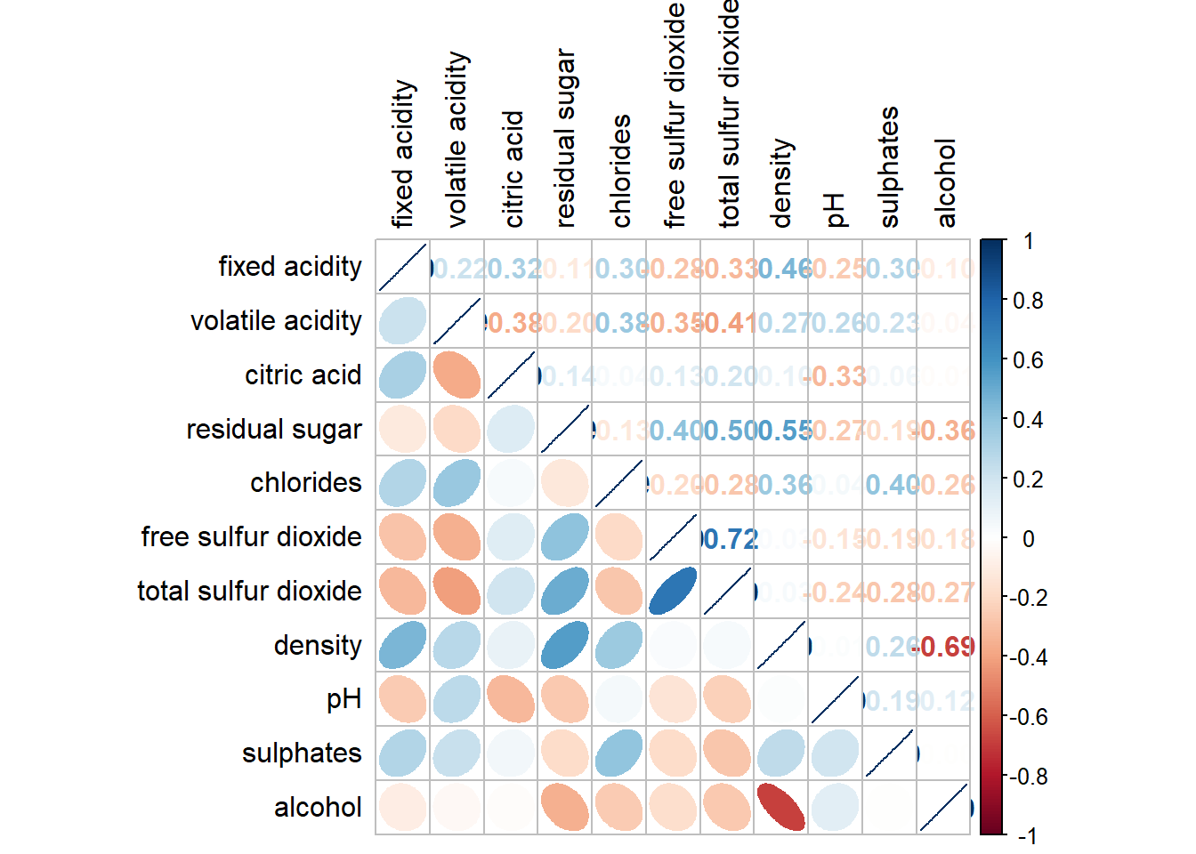Figure below shows a mixed layout corrgram plotted using wine quality data.