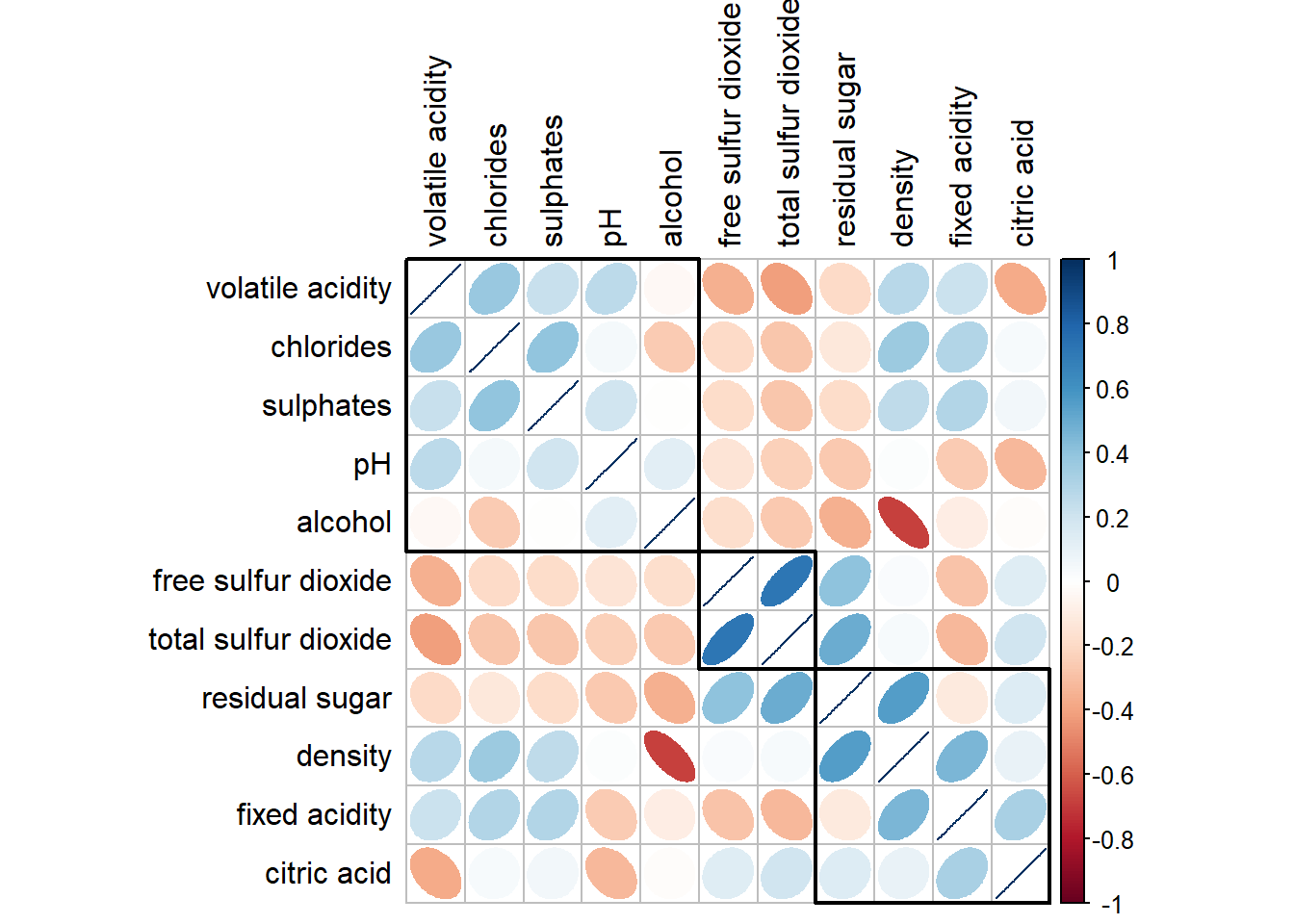 Figure below shows a corrgram combined with the significant test. The corrgram reveals that not all correlation pairs are statistically significant. For example the correlation between total sulfur dioxide and free surfur dioxide is statistically significant at significant level of 0.1 but not the pair between total sulfur dioxide and citric acid.