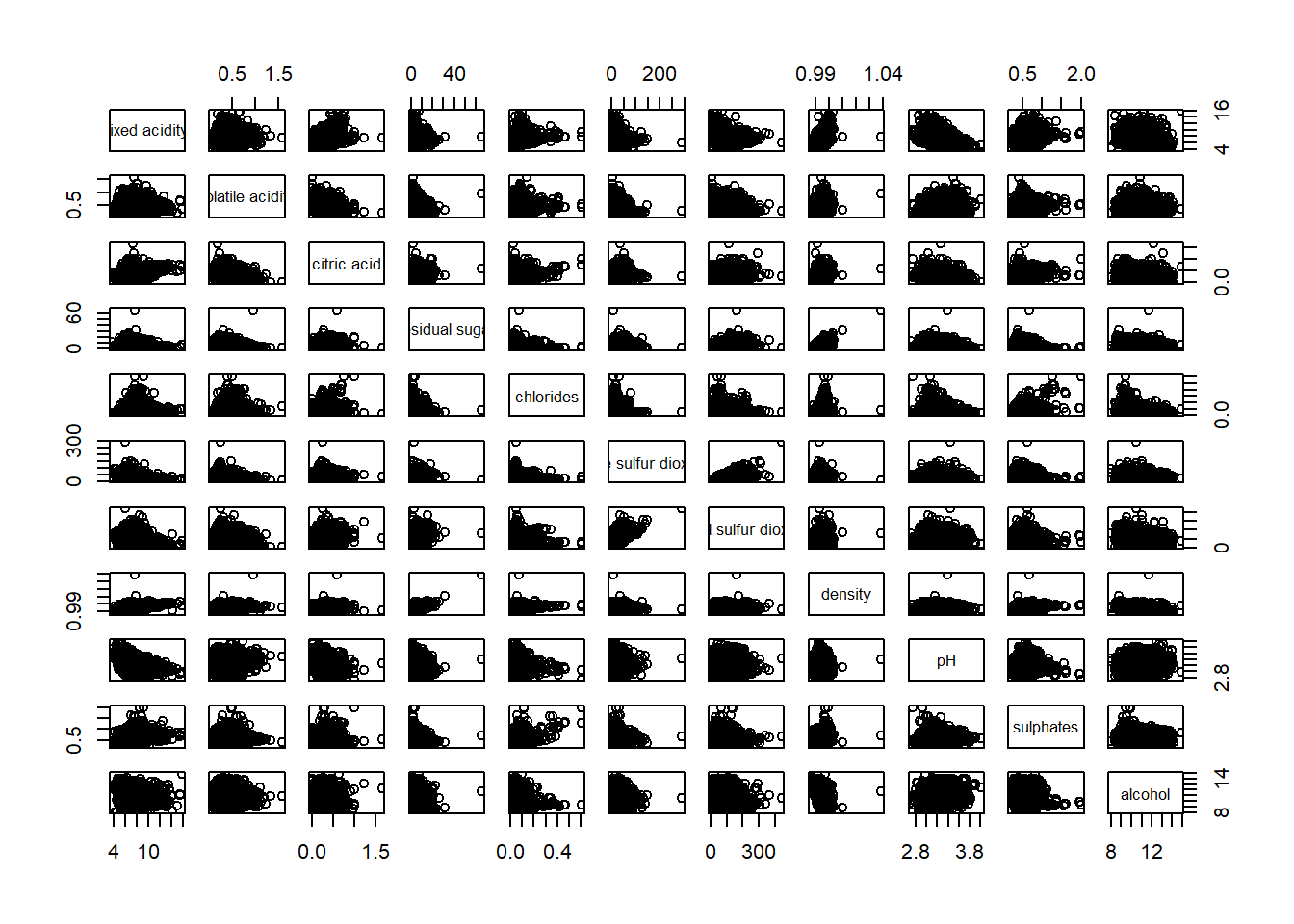 Figure below shows the scatter plot matrix of Wine Quality Data. It is a 11 by 11 matrix.