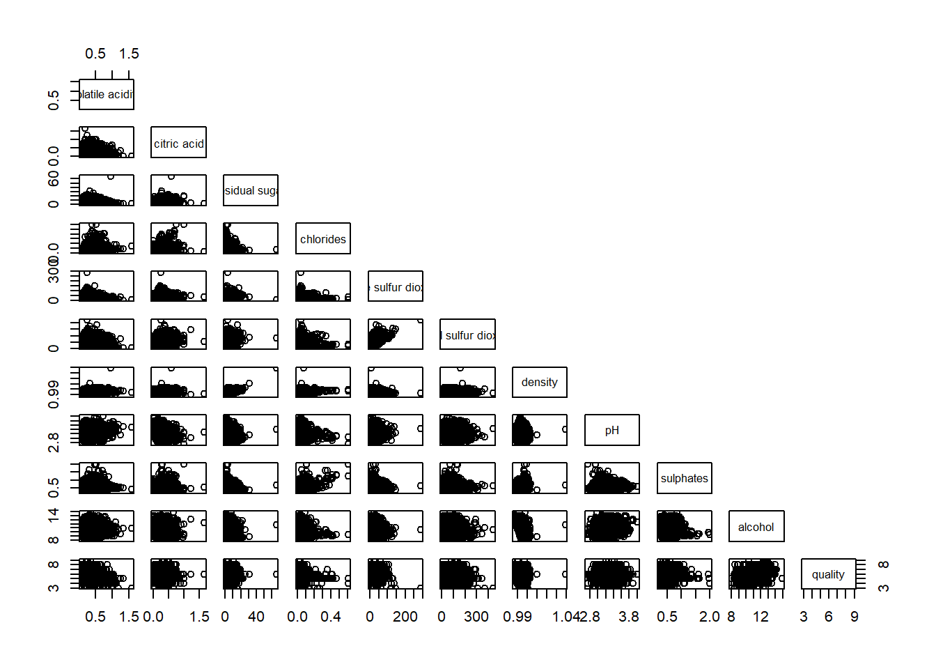 pairs(wine[,2:12], lower.panel = NULL)