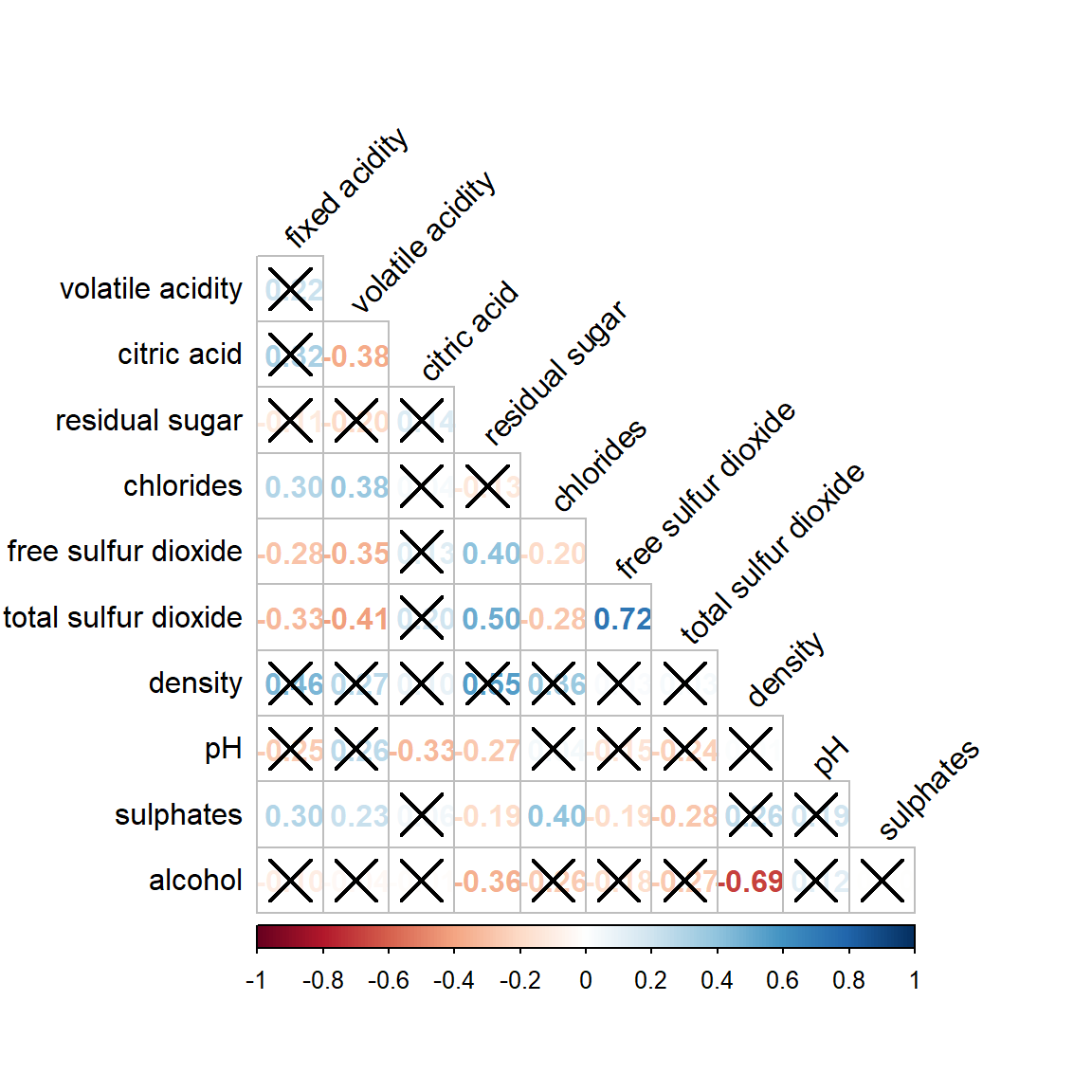 wine.sig = cor.mtest(wine.cor, conf.level= .95)We can then use the p.mat argument of corrplot function as shown in the code chunk below.